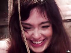 Hogtied busty babe hairy pussy fingered